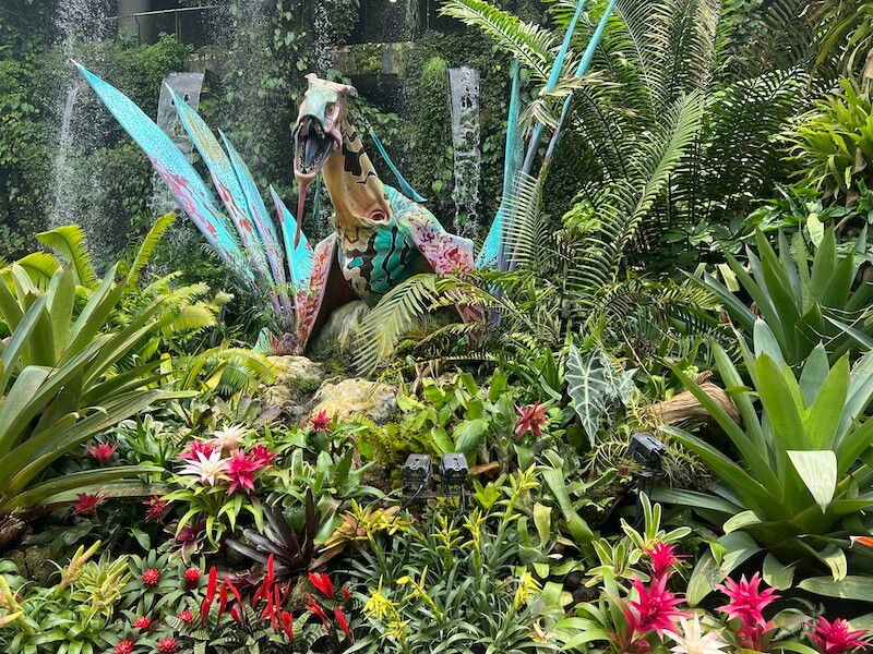 - Cloud Forest – nekakšen tropski deževni gozd z največjim umetnim slapom na Svetu, ki je zgrajen v zaprtem prostoru. Celoten Cloud Forest se nahaja v zaprti kupoli, kjer je vse umetno, razen rastja in rastlin. Prostor je tudi v celoti klimatiziran. Tukaj so zbrane številne rastline iz celotnega sveta in celo lepo uspevajo. Čez celoten gozd je speljana tlakovana pot. Vstopnina je 53 SD, v katero je vštet tudi obisk Flower Dome. V času najinega obiska je bila v Cloud Forest razstava Avatarja, kar pomeni, da so bili po gozdu skriti liki iz Avatarja, ki so se oglašali in premikali. Ker sem navdušena nad Avatarjem, mi je bila celotna izkušnja izjemno všeč.